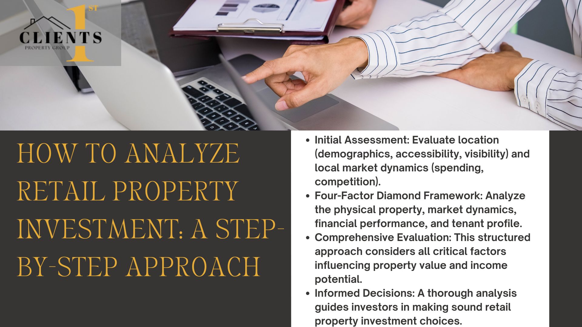 Investors seeking to maximize returns must thoroughly analyze retail properties using a structured methodology. At Clients1st Property Group, located in Charlotte, North Carolina, we guide investors through this process with expertise and precision.