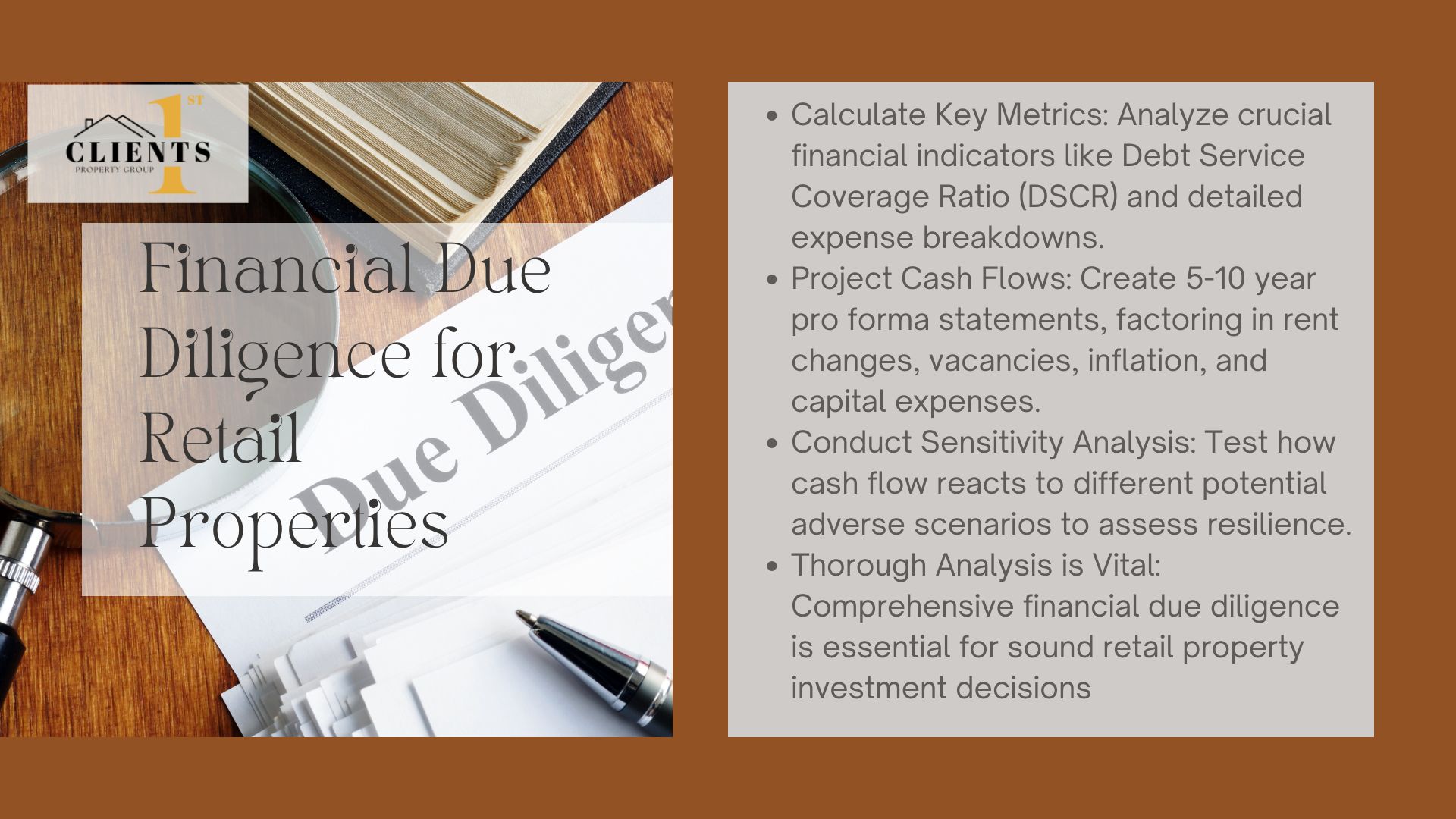 At Clients1st Property Group, based in Charlotte, North Carolina, we understand the complexities of analyzing retail property investments. Our expertise can guide investors through the essential steps and considerations, providing a structured approach to making informed decisions in today’s evolving market landscape.