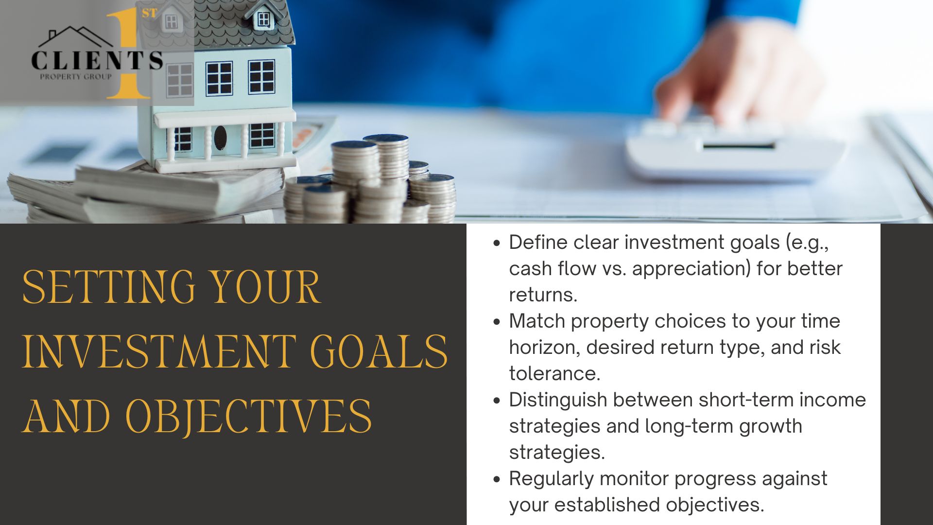“Every financing choice impacts long-term returns. We help clients model scenarios to compare 5-year outcomes across options,” advises Clients 1st Property Group.