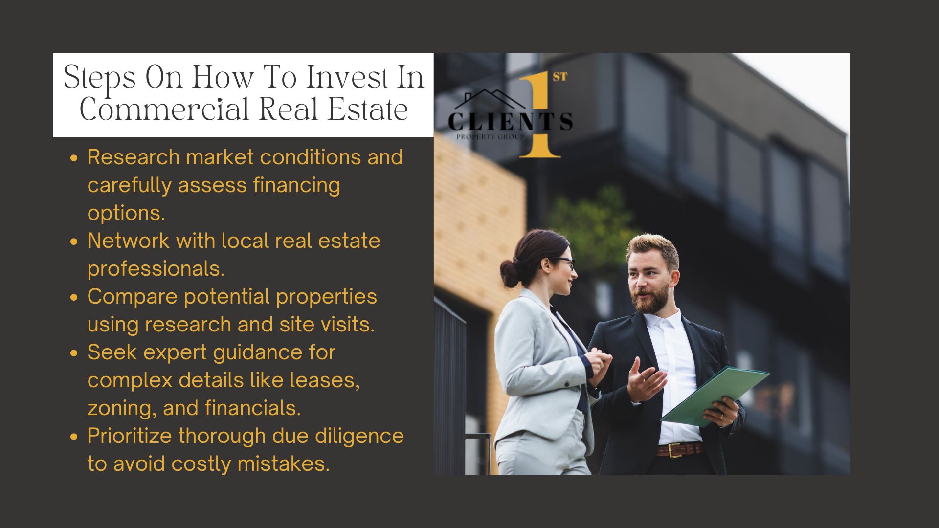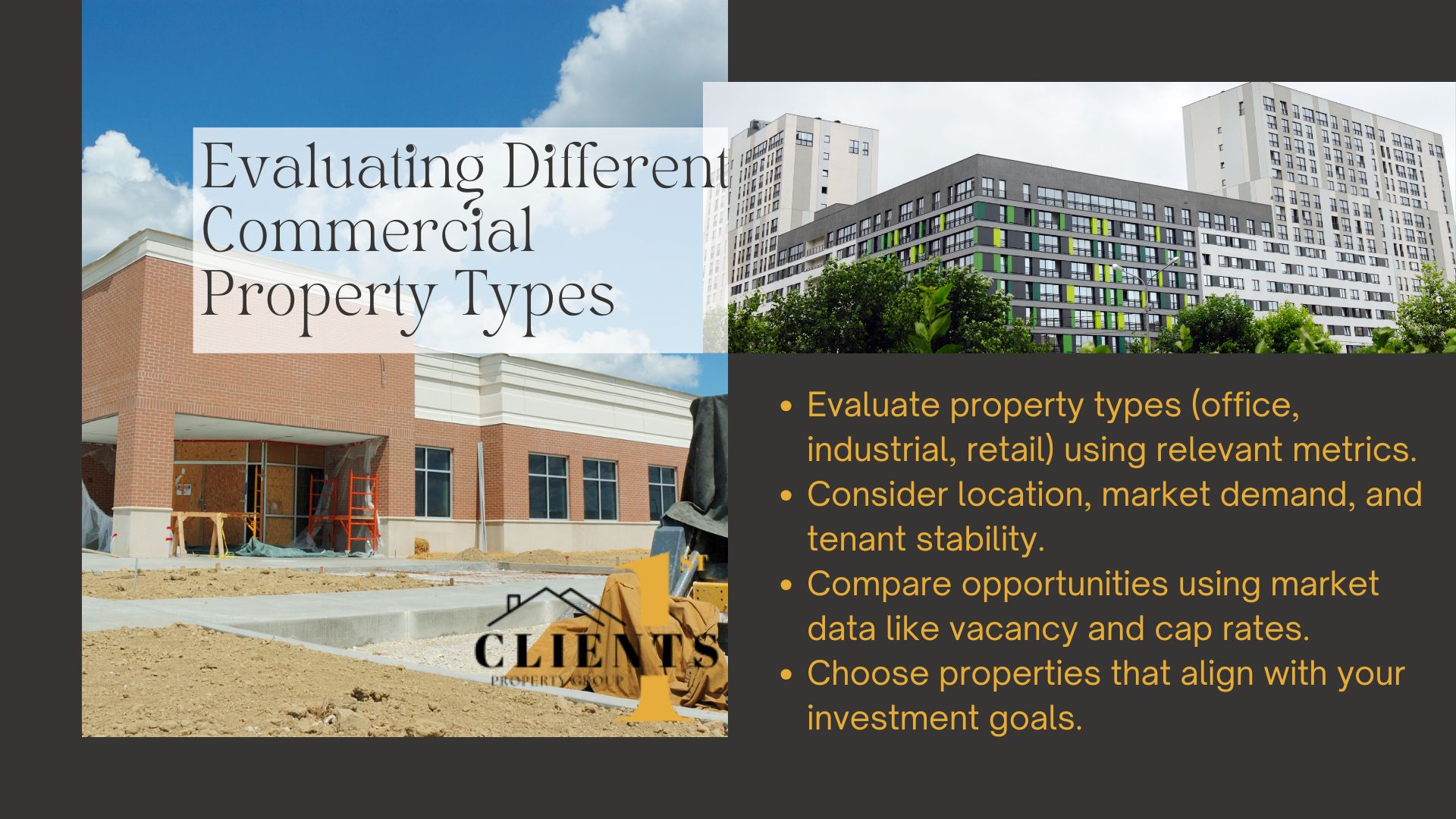 Newcomers often benefit from partnering with experienced advisors like Clients 1st Property Group. Their local expertise helps simplify concepts like lease structures, tenant retention, and market analysis. Whether targeting retail plazas or mixed-use developments, aligning choices with financial goals reduces risk.