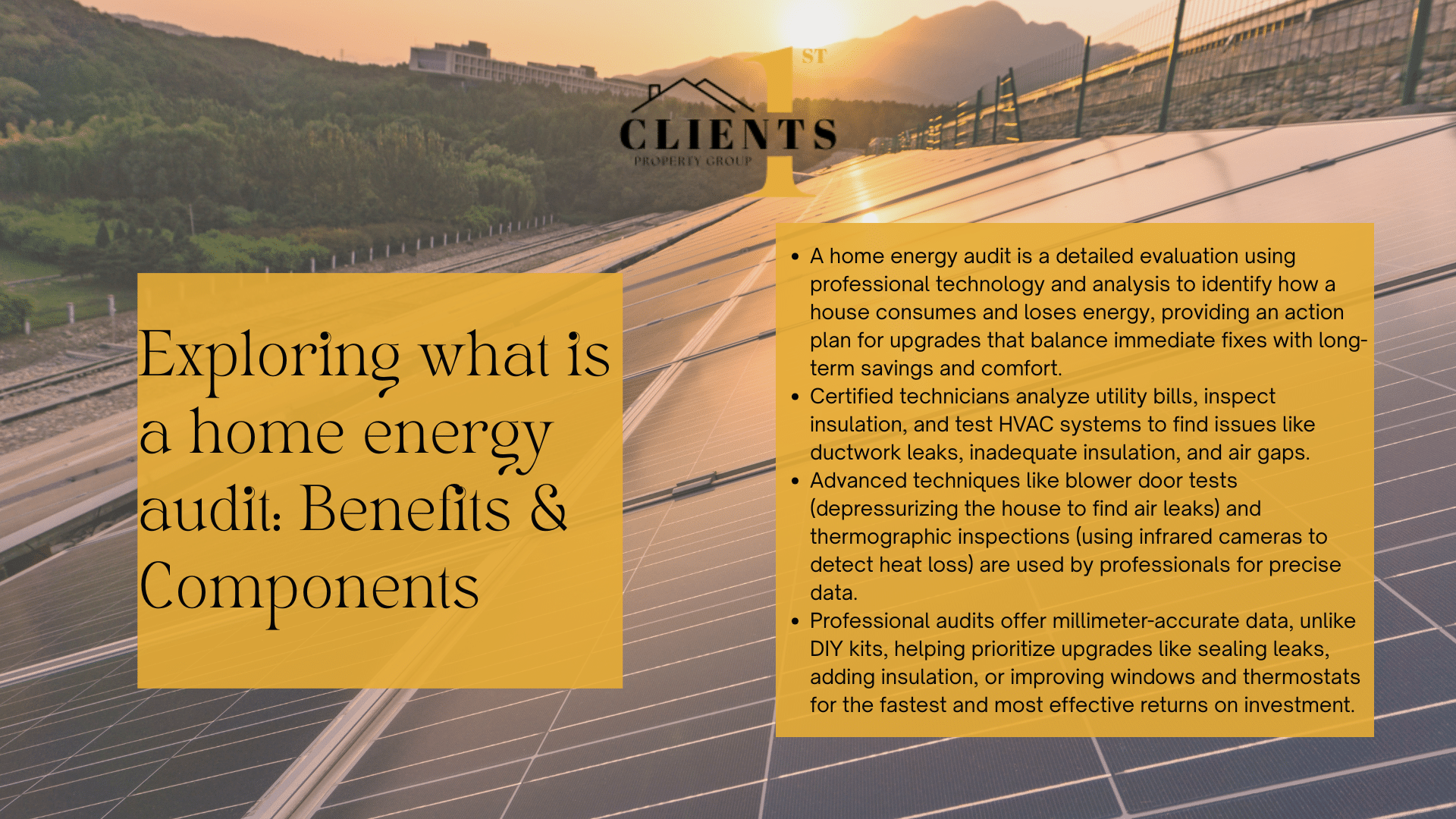 Beyond savings, these evaluations improve indoor air quality and reduce environmental strain. Clients1st Property Group emphasizes that understanding your property’s performance is critical before investing in solar panels, smart thermostats, or other improvements. Their team offers tailored recommendations to align upgrades with your goals.