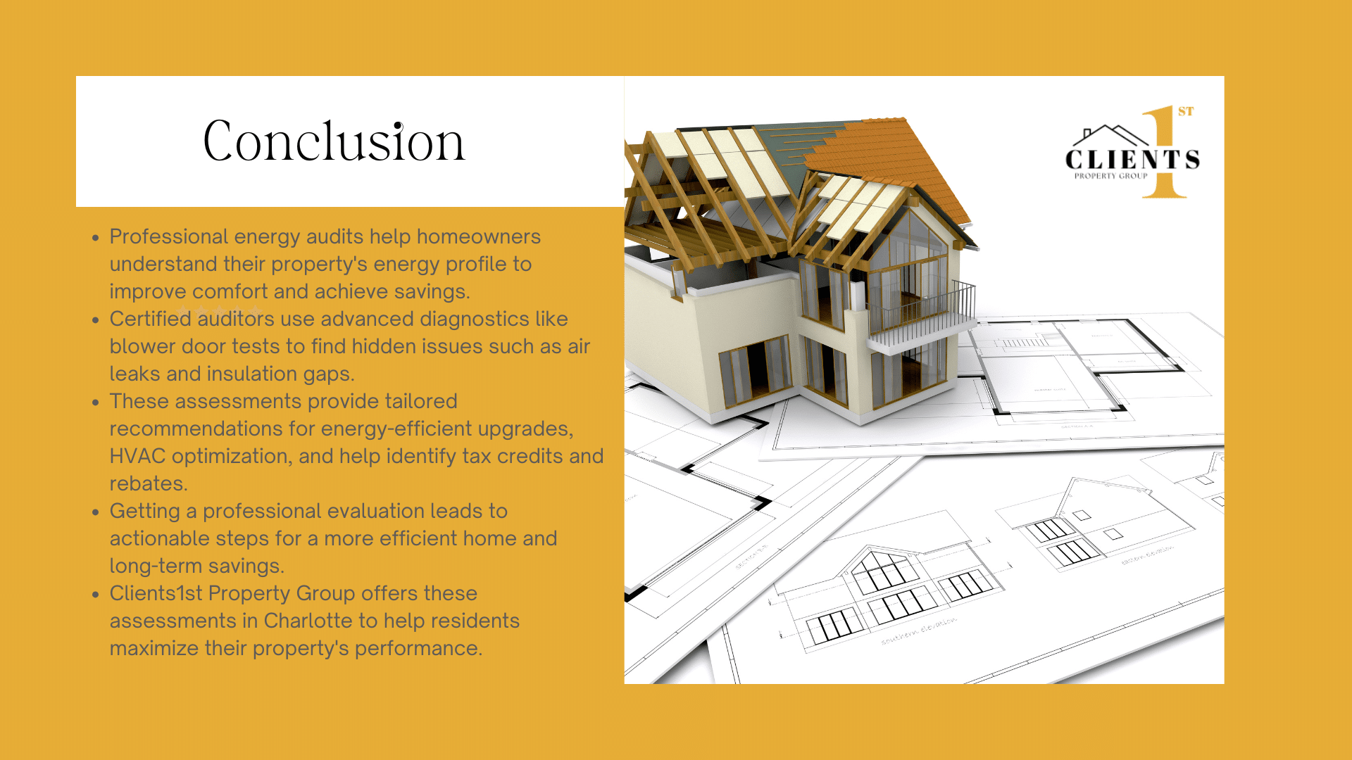 Take control of your property’s performance today. Clients1st Property Group’s team transforms technical data into actionable steps for safer, more efficient living spaces. Call (704) 622-4865 to schedule your Charlotte-based assessment and start maximizing long-term savings.