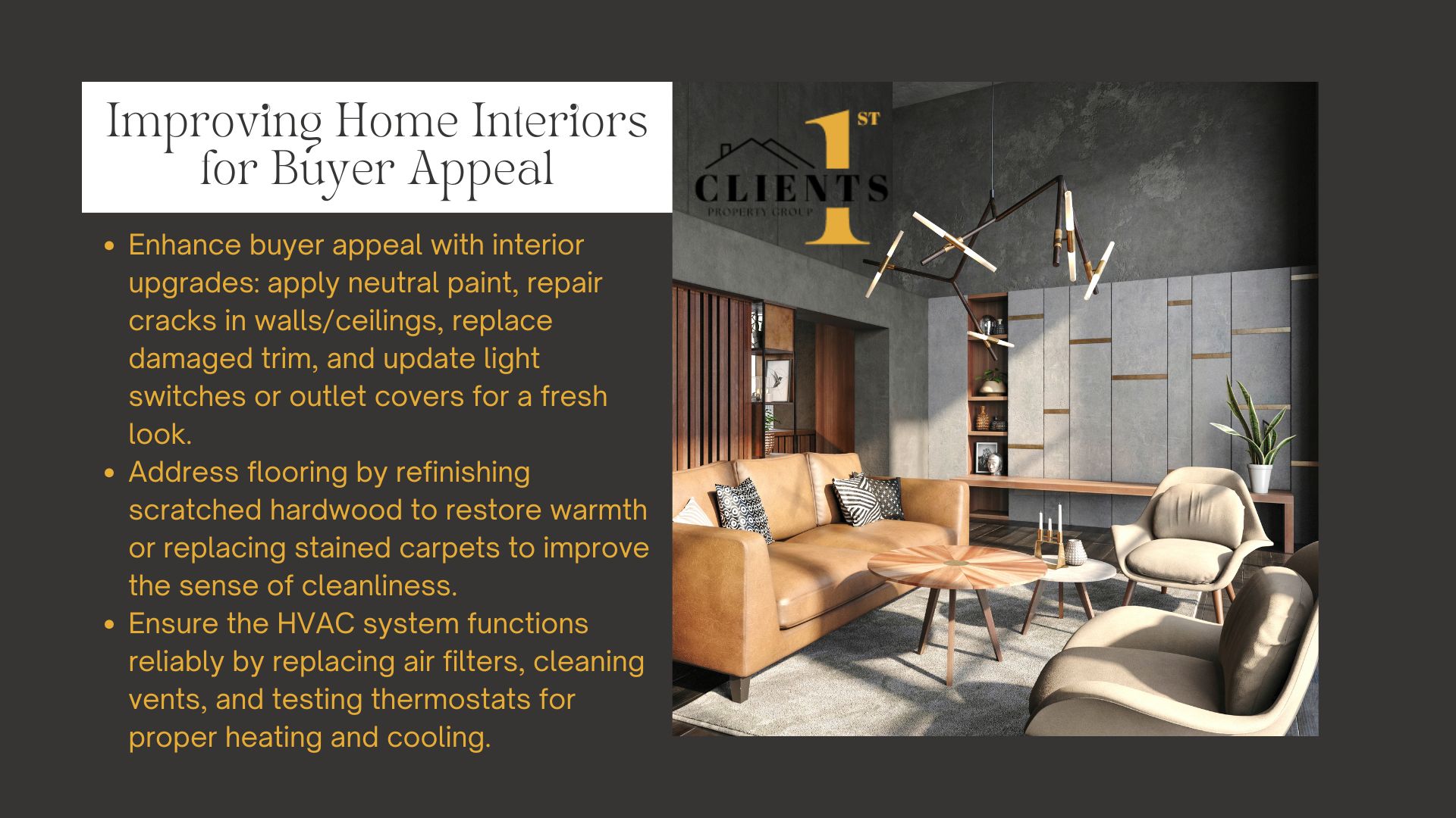 Partnering with Clients1st Property Group ensures sellers prioritize cost-effective improvements aligned with local buyer preferences. Their team identifies high-return projects, from patching drywall to upgrading insulation, fostering trust and streamlining transactions.